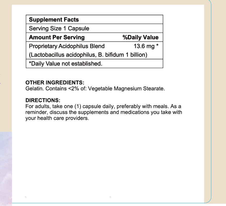 May Support Gastro-Intestinal Health. Ingredients: Proprietary Acidophilus Blend 13.6mg. Other Ingredients: Gelatin. Contains <2% of: Vegetable Magnesium...