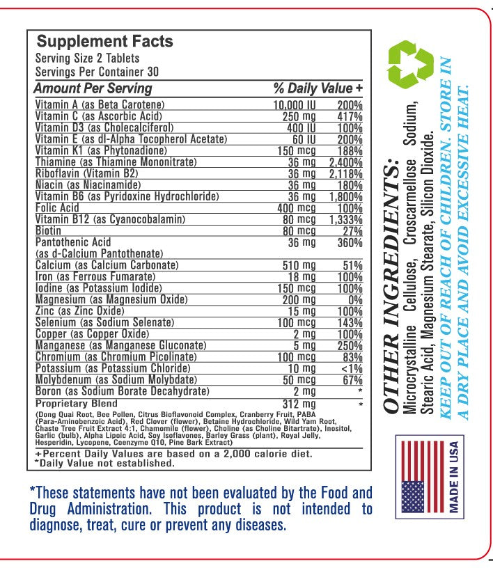Vitamin A (as Beta Carotene) 10000IU, Vitamin C (as Ascorbic Acid) 250mg, Vitamin D3 (as Cholecalciferol) 400IU, Vitamin E (as dl-Alpha Tocopherol Acetate) 60IU, Vitamin K1 (as Phytonadione) 150mcg, Thiamine (as Thiamine Mononitrate) 36mg, Riboflavin (Vitamin B2) 36mg, Niacin (as Niacinamide) 36mg, Vitamin B6 (as Pyridoxine Hydrochloride) 36mg, Folic Acid 400mcg, Vitamin B12 (as Cyanocobalamin) 80mcg, Biotin 80mcg, Pantothenic Acid (as d-Calcium Pantothenate) 36mg, Calcium (as Calcium Carbonate) 510mg, Iron (as Ferrous Fumarate) 18mg, Iodine (as Potassium Iodide) 150mcg, Magnesium (as Magnesium Oxide) 200mg, Zinc (as Zinc Oxide) 15mg, Selenium (as Sodium Selenate) 100mcg, Copper (as Copper Oxide) 2mg, Manganese (as Manganese Gluconate) 5mg, Proprietary Blend 312mg. Other Ingredients: Microcrystalline Cellulose, Croscarmellose Sodium, Stearic Acid, Magnesium Stearate, Silicon Dioxide.Directions: