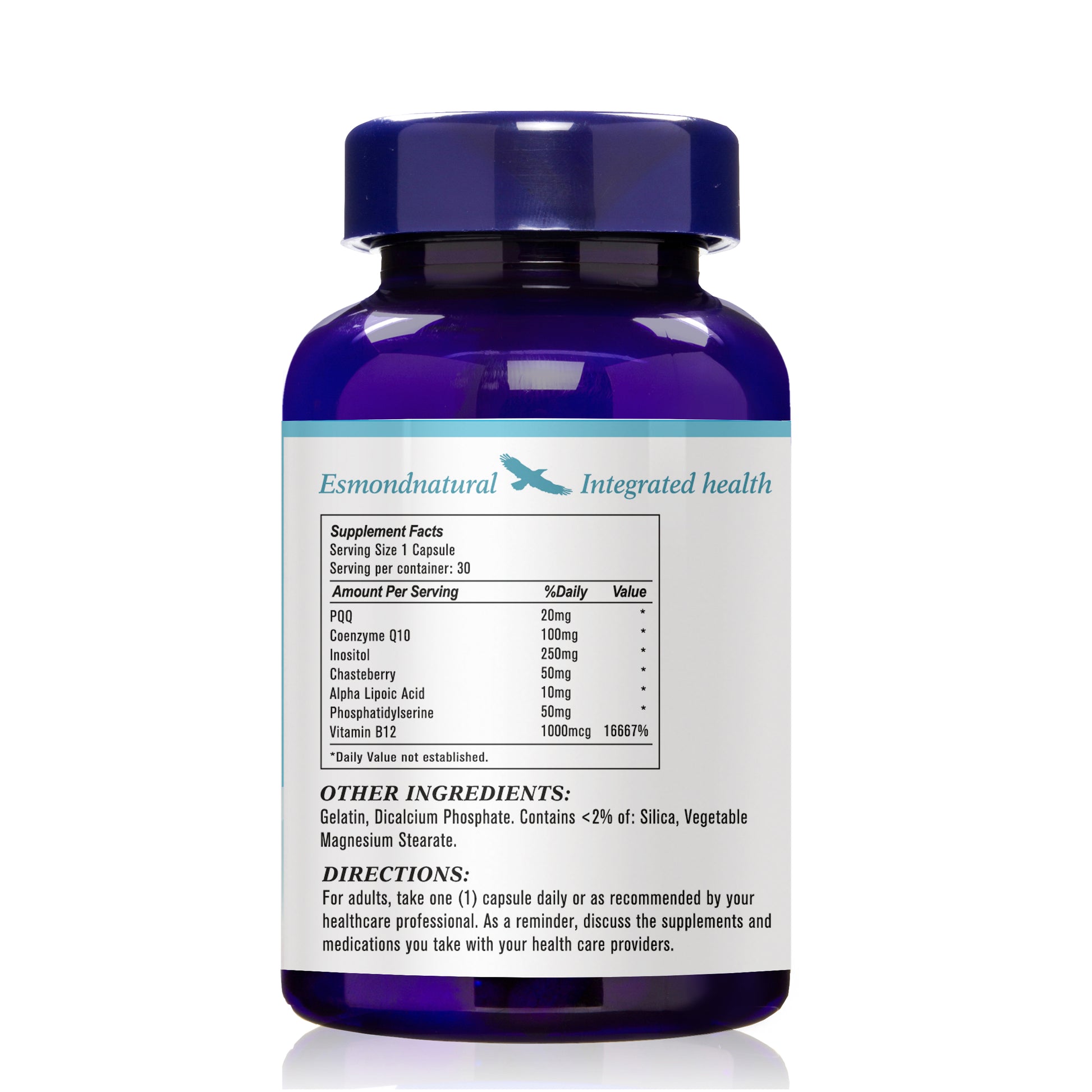PQQ 20mg, Coenzyme Q10 100mg, Inositol 250mg, Chasteberry 50mg, Alpha Lipoic Acid 10mg, Phosphatidylserine 50mg, Vitamin B12 1000mcg. Other Ingredients: Gelatin, Dicalcium Phosphate. Contains <2% of: Silica, Vegetable Magnesium Stearate.Directions: